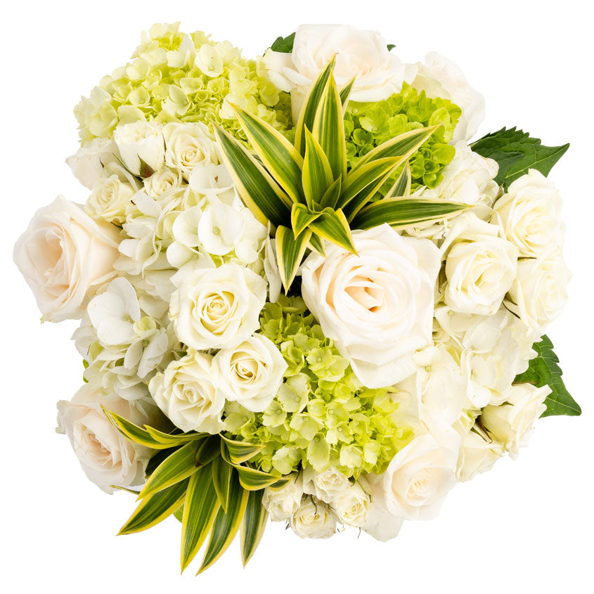 Offer comfort and peace with this elegant bouquet of soft white lilies, roses, and greenery. A gentle expression of sympathy, honoring love and cherished memories.